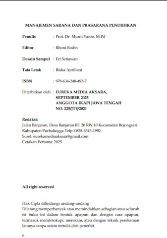 literatur yang tidak hanya menjelaskan konsep dasar manajemen sarana dan prasarana pendidikan, tetapi juga memuat pendekatan praktis yang kontekstual dengan perkembangan zaman. Dalam buku ini, penulis memadukan antara teori manajerial, regulasi pendidikan nasional, serta praktik baik dari berbagai institusi pendidikan, sehingga pembaca dapat memperoleh pemahaman yang holistik dan aplikatif. Ditujukan bagi mahasiswa, pendidik, kepala sekolah, tenaga kependidikan, dan pengambil kebijakan, buku ini diharapkan menjadi referensi yang relevan dalam meningkatkan kapasitas kelembagaan pendidikan, khususnya dalam hal pengelolaan aset fisik, ruang belajar, laboratorium, perpustakaan, hingga pemanfaatan teknologi dan ruang digital sebagai bagian dari